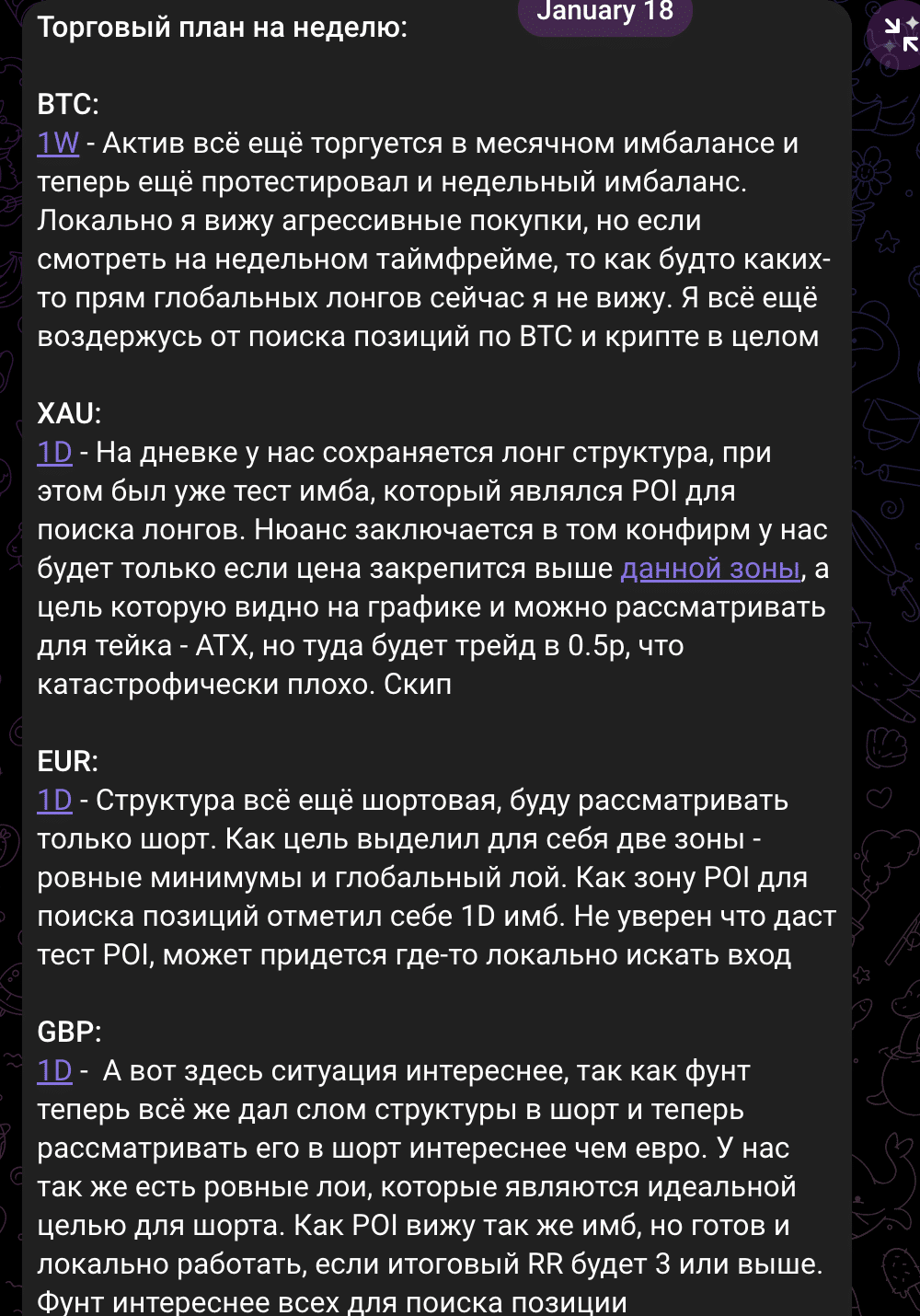 Публикации ведутся нерегулярно: активные периоды чередуются с паузами. Темы постов варьируются от торговли сигналами в телеграмме, кратких комментариев к движениям рынка до отдельных заметок для аналитики. Полноценные разборы сделок с чётко обозначенными входами, стопами и результатами по времени встречаются не часто. Графики публикуются в качестве иллюстраций к идеям, а не отчётов по закрытым позициям. Примеры последних постов в открытом канале приведены в виде анонсов торговых идей без единого формата отчетности, что составляет трудности для оценки телеграмм AM1654 TRADING активности и уровня аналитики ​‍​‌‍​‍‌рынка.
