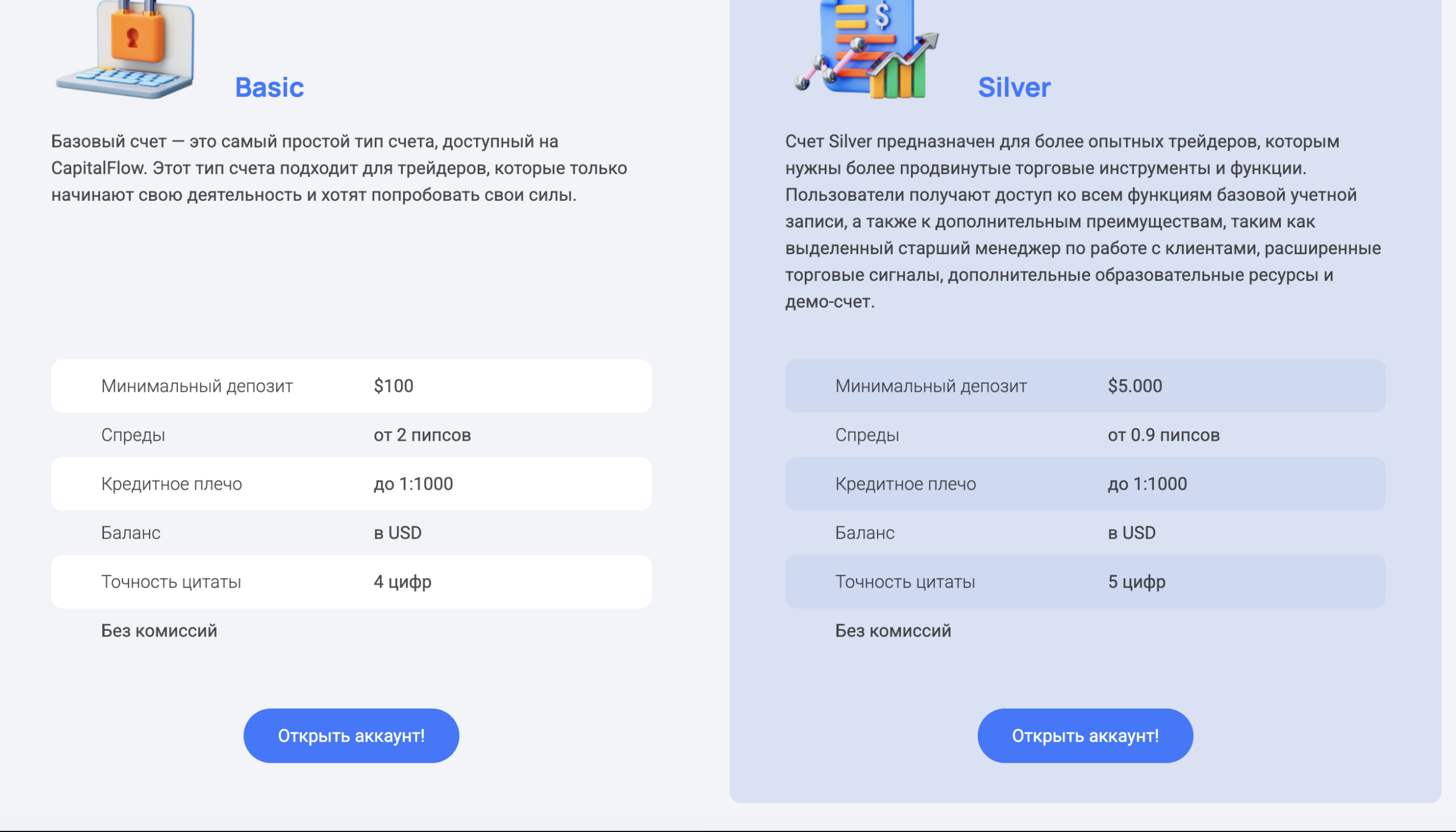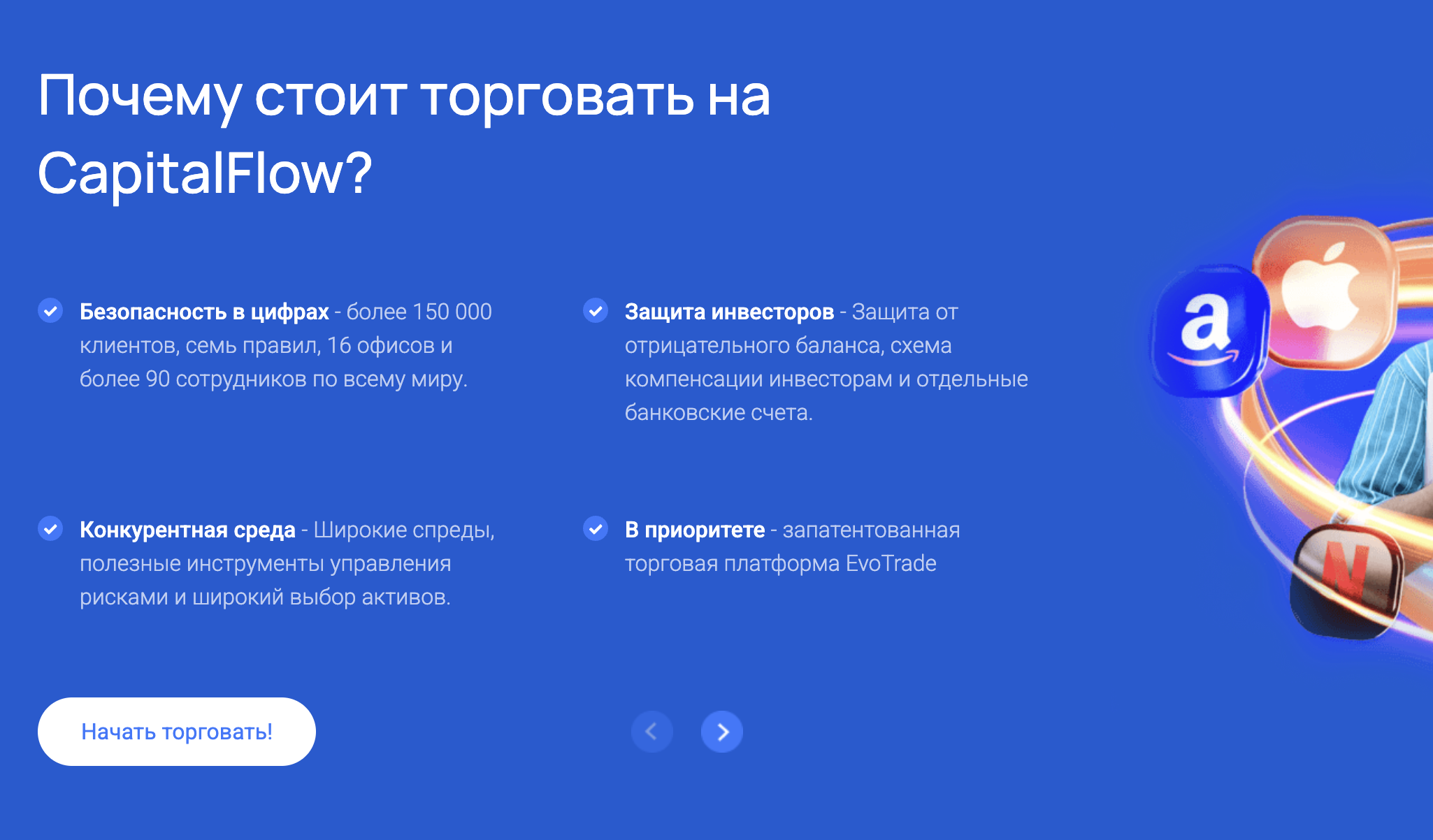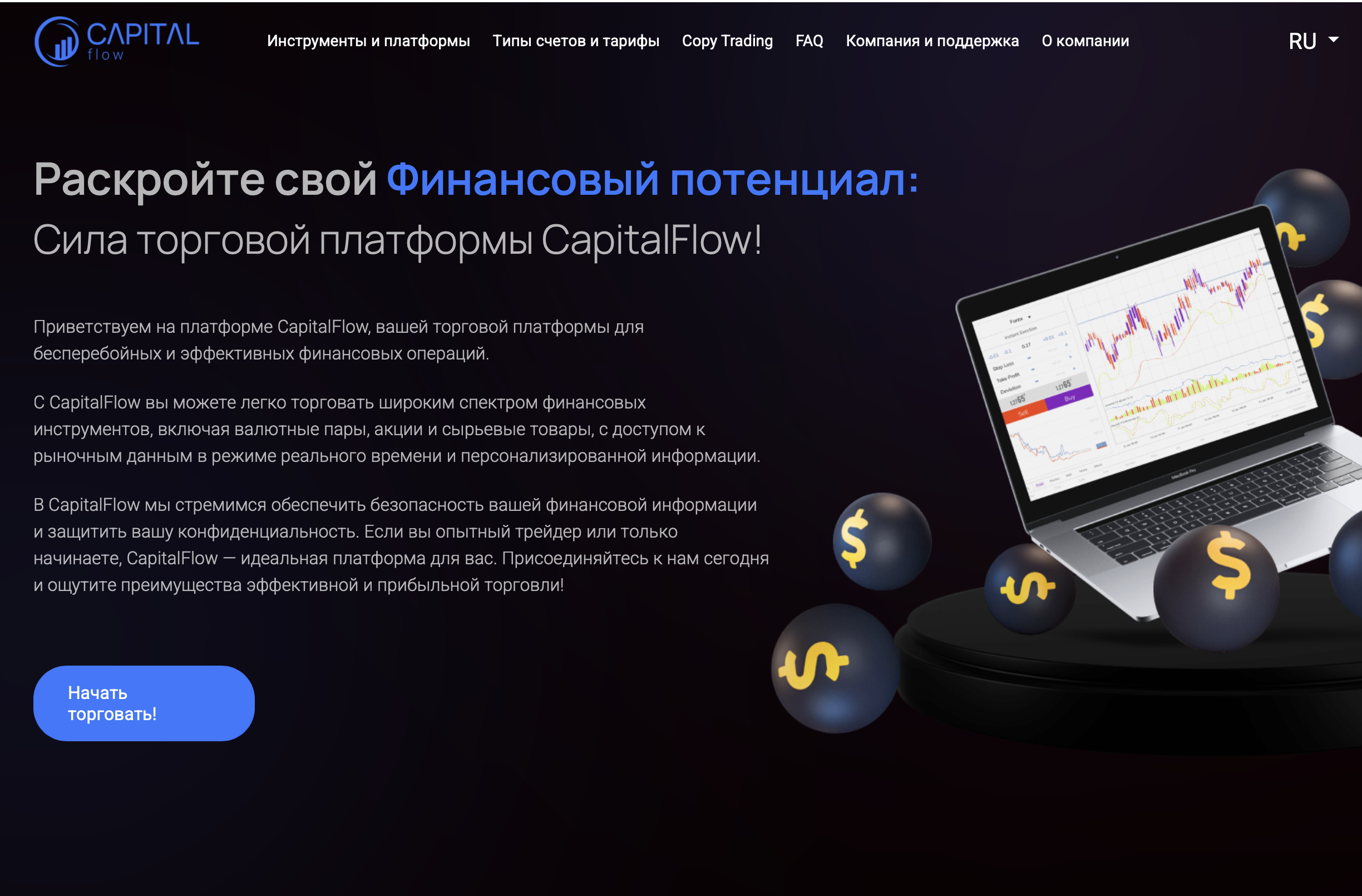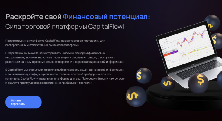 CapitalFlow описывается как брокерская компания, ориентированная на торговлю на финансовых рынках. Сайт подчёркивает наличие более 150 инструментов, включая валютные пары, акции, индексы, сырьё и криптовалюту. Торговля осуществляется через веб-терминал без установки дополнительного ПО, с обещаниями низких спредов и быстрого исполнения ордеров.