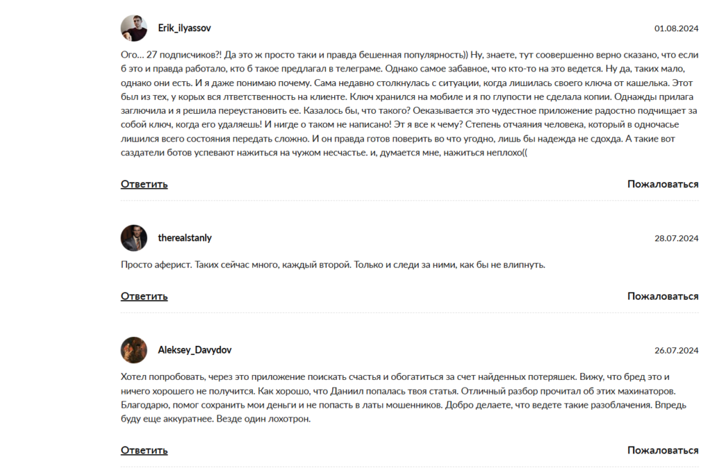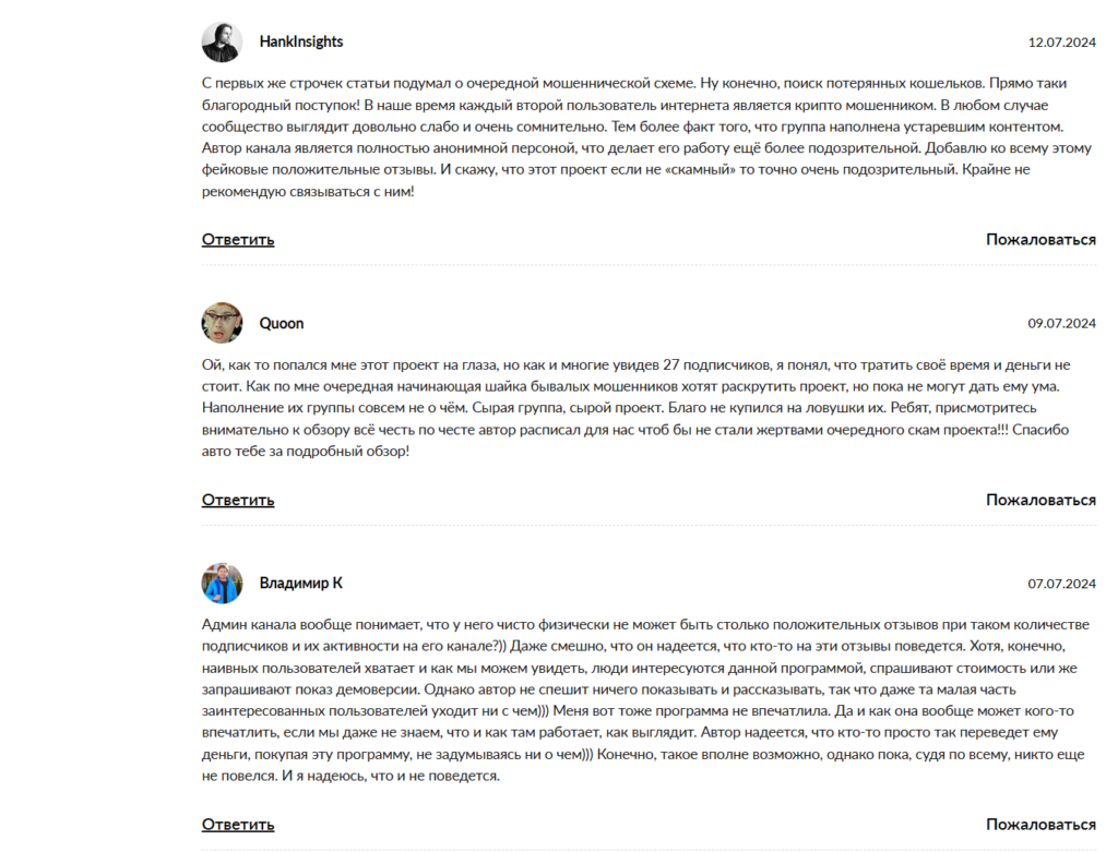 В этих картинках несуществующие люди благодарят автора за спасение из финансовой ямы и демонстрируют гигантские балансы. При этом найти настоящие отзывы на независимых тематических ресурсах и профильных форумах практически невозможно. Те редкие смельчаки, которые пытаются достучаться до автора в комментариях под его рекламными постами на сторонних сайтах, с просьбой показать работу программы в демо-режиме или хотя бы озвучить внятную стоимость, сталкиваются с глухой и непробиваемой стеной молчания. На неудобные вопросы здесь отвечать категорически не принято, ведь любая попытка проверить факты моментально разрушает хрупкий карточный домик этого сомнительного предприятия.