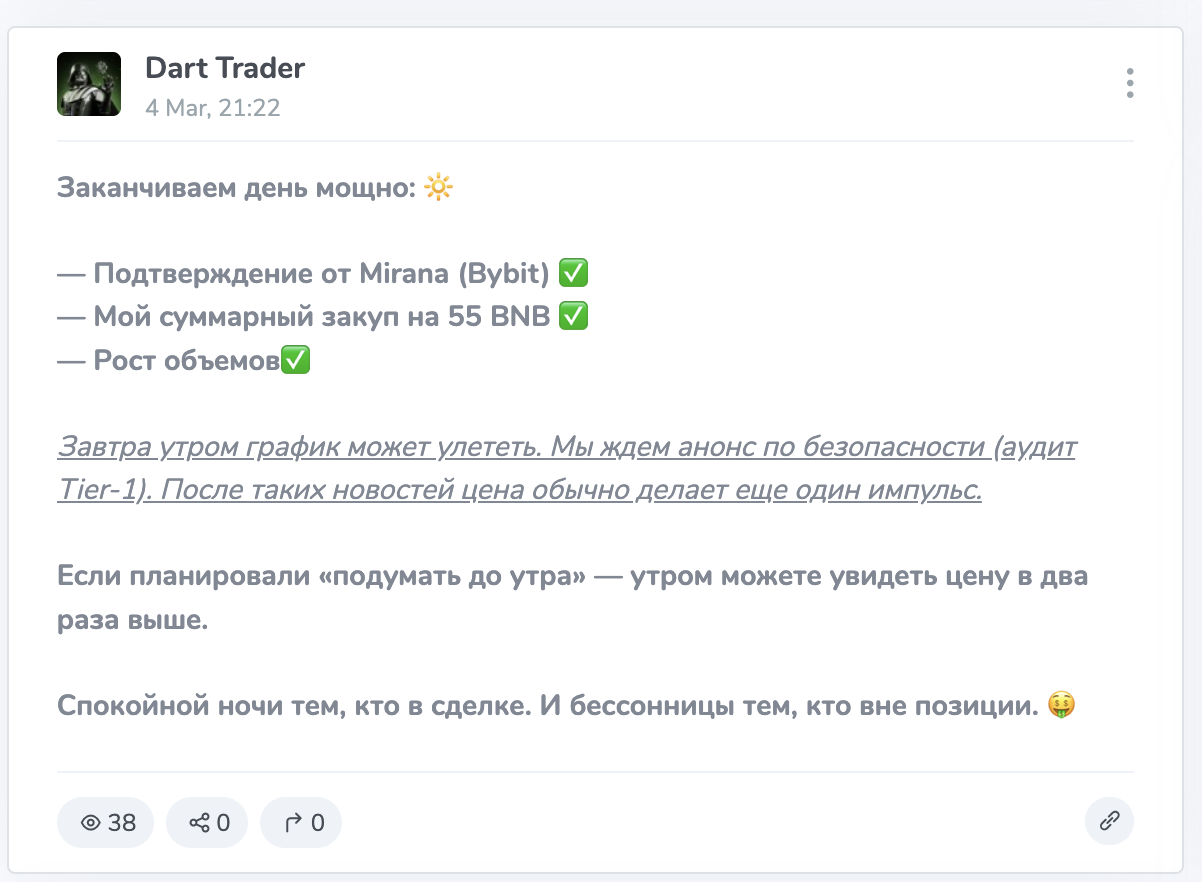 Главный продукт, который так активно продает этот гуру, это его уникальные торговые сигналы и аналитика рынка. В ленте канала регулярно появляются скриншоты фантастически прибыльных сделок, которые якобы закрываются с двухзначной доходностью за считанные часы. Секрет такой безупречной результативности предельно прост: большинство этих картинок публикуется уже после того, как цена совершила свое движение. Это классическая уловка продавцов воздуха, которые просто подгоняют факты под свершившийся результат. Никакого верифицированного портфеля, открытых счетов или сквозного торгового журнала со всеми входами и выходами в природе просто не существует. Автор упорно отказывается подтверждать свою квалификацию независимыми источниками, предпочитая кормить аудиторию пустыми обещаниями и нарисованными цифрами. В ленте нет глубокого разбора рыночных ситуаций, только короткие эмоциональные сообщения с призывом скорее открывать сделку на всю котлету.