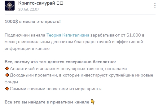 Помимо выманивания средств за доступы в мифические клубы, данный ресурс активно промышляет заработком на самых низкосортных рекламных интеграциях. Вместо того чтобы беречь свою профессиональную репутацию, загадочный самурай без малейшего зазрения совести рекомендует своей аудитории другие мутные каналы и сказочных персонажей, называющих себя миллиардерами. Читателей настойчиво загоняют в специализированные боты и уговаривают регистрироваться на сомнительных биржах исключительно по реферальным ссылкам автора. Гениальность этой партнерской схемы заключается в том, что владелец ссылки получает солидное вознаграждение именно в тот момент, когда приглашенный им человек терпит неудачу и полностью сливает свой депозит. Получается весьма циничная и печальная картина: вам раздают заведомо убыточные советы, чтобы вы как можно быстрее потеряли свои сбережения, а советчик радостно получил свой процент от ваших неудач. Все это превращает канал из сообщества по интересам в настоящую токсичную свалку, где единственной целью является максимальное выжимание средств из каждого случайно зашедшего пользователя.