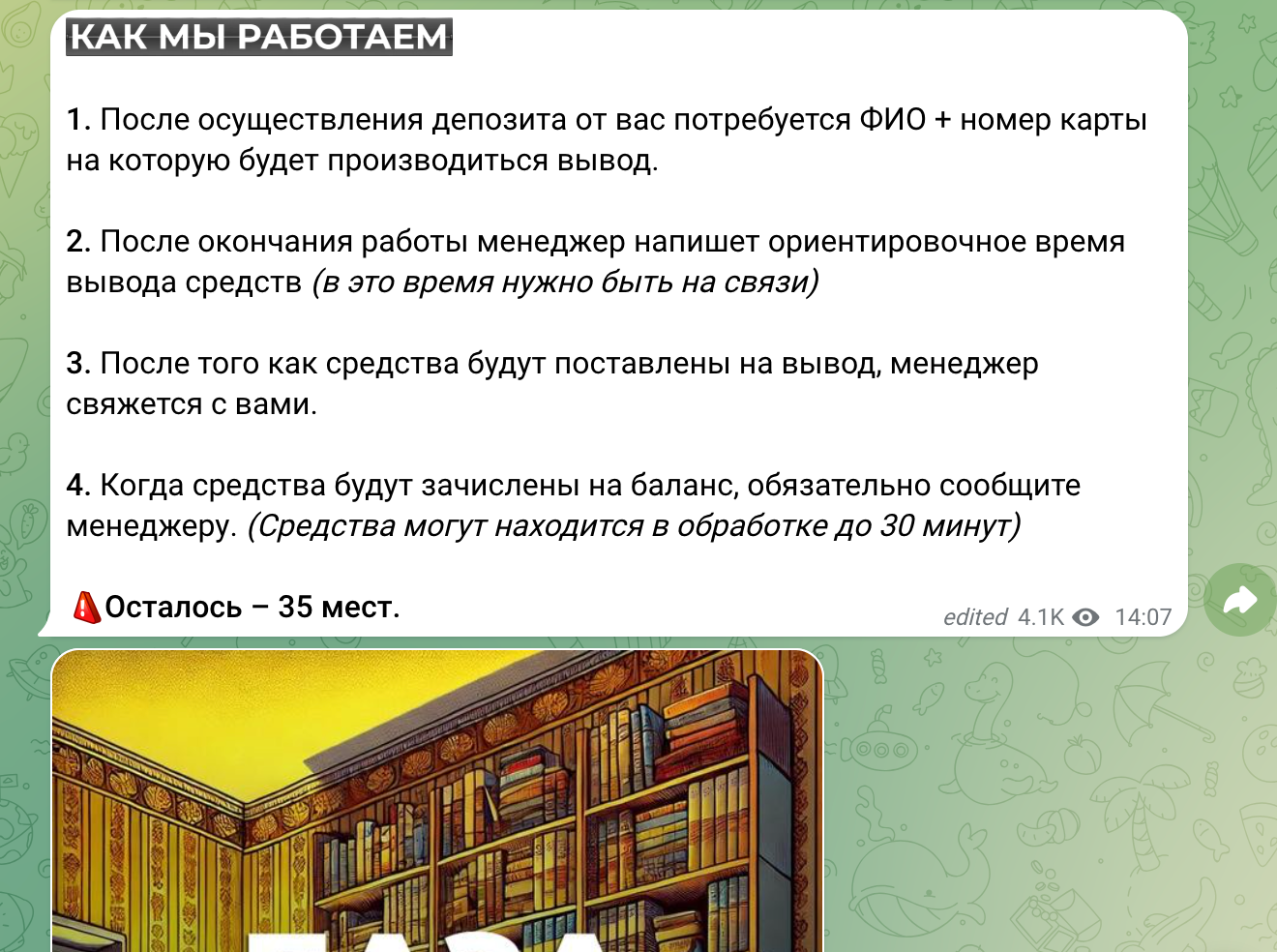 Подписчикам предлагают выполнить перевод денег на указанные реквизиты под предлогом участия в финансовых операциях. В публикациях и личных сообщениях формируются финансовые обещания, связанные с быстрым доходом и краткими сроками получения результата. Условия перевода средств описываются поверхностно, без договоров и подтвержденных ​‍​‌‍​‍‌гарантий.