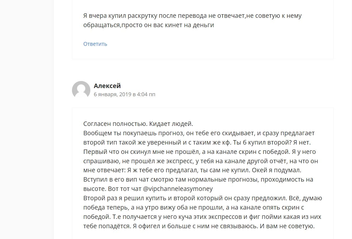 Easy Money — это еще один канал в Телеграме. Основным менеджером канала выступает некий Александр Захаров. Что он предлагает именно? Это платные экспрессы с высоким коэффициентом. И все, что вам нужно, это просто поставить деньги и ждать огромную прибыль. Ведь в подобных каналах, вам будут обещать прибыль в пять, а то и в 10 раз больше. Но есть одно, но. Это обычные лохотроны. И их основная задача заманить как можно больше доверчивых людей и развести на нормальные деньги. Никаких выплат на Easy Money Александра Захарова нет и быть не может! А такие каналы появляться в Телеграм ежедневно.