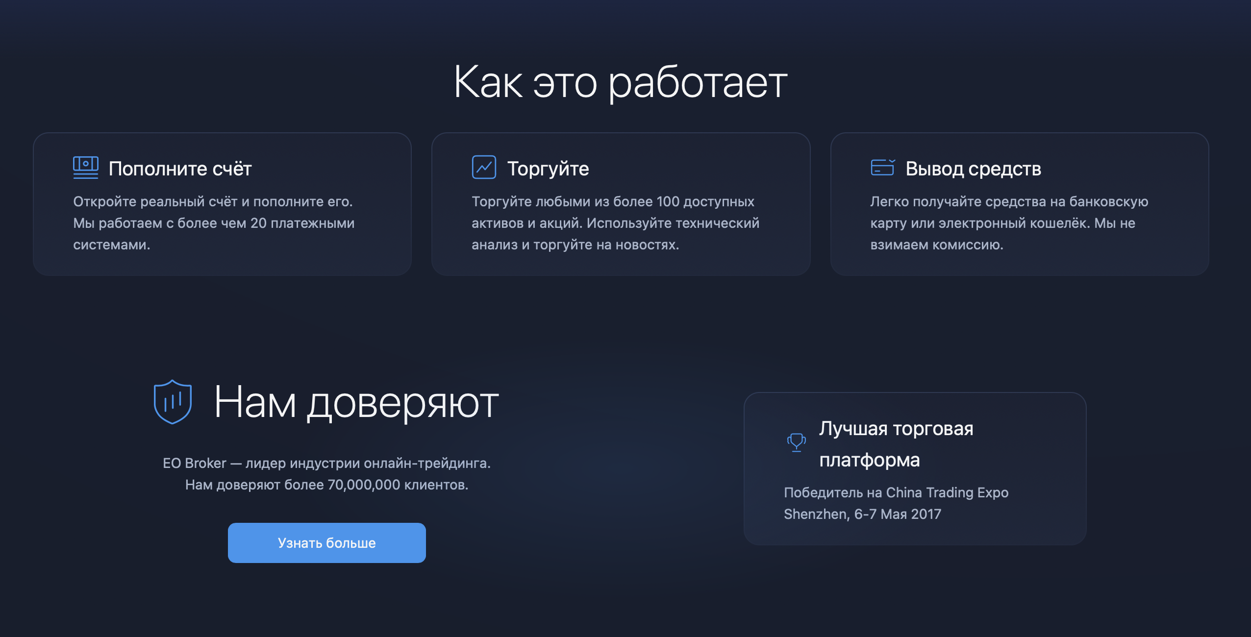 Когда пользователь впервые заходит на ru.eobrkr.com, сайт производит впечатление современной площадки с акцентом на лёгкий доступ к мировым рынкам. Много ярких слов о выгодных условиях, инновационном терминале и персональном сопровождении. Но если начинать копать чуть глубже, сразу становится заметно, что внешняя привлекательность — едва ли не единственное сильное место проекта.