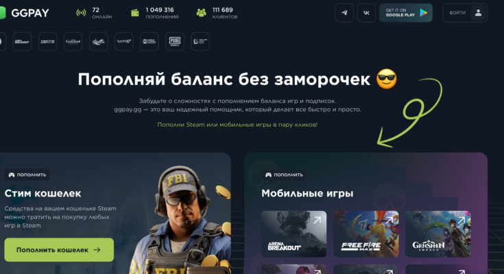 GGpay.gg — платформа для моментального пополнения игровых кошельков и покупки цифровых товаров. Основные направления — пополнение Steam и донаты в популярные мобильные проекты (Genshin Impact, PUBG Mobile, Mobile Legends и другие). Сервис ориентирован на игроков из России и СНГ, которым в 2026 году нужны простые способы оплаты без использования VPN и иностранных карт.