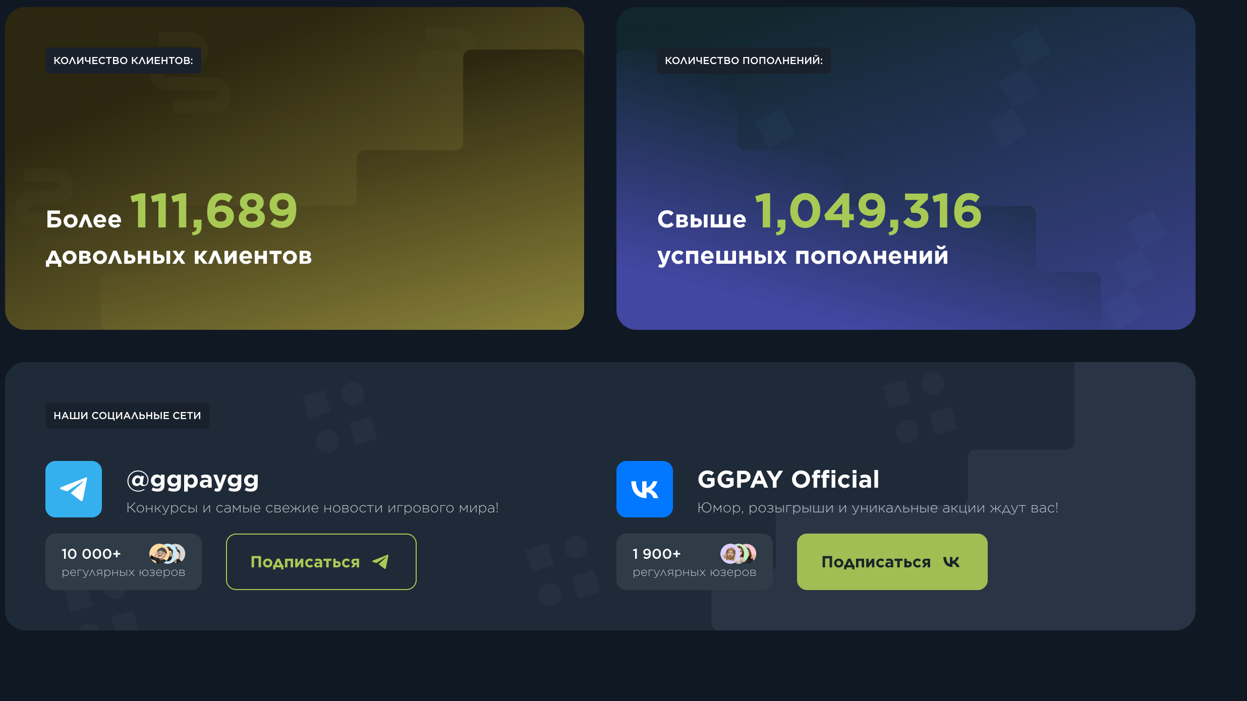 GGpay.gg официальный сайт работает с 2023–2024 годов (по косвенным данным из активности группы ВК и первых упоминаний). За это время сервис обработал более 1 млн транзакций (статистика указана на главной странице ggpay.gg по состоянию на январь 2026). Целевая аудитория — геймеры, которые хотят быстро купить игры в Steam, примогемы в Genshin Impact, UC в PUBG Mobile или алмазы в Mobile Legends, избегая сложных обходных путей.