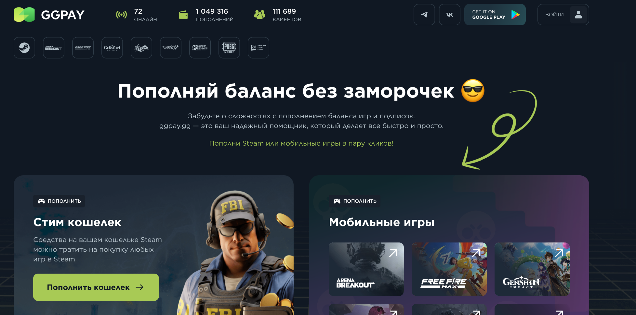 GGpay.gg — платформа для моментального пополнения игровых кошельков и покупки цифровых товаров. Основные направления — пополнение Steam и донаты в популярные мобильные проекты (Genshin Impact, PUBG Mobile, Mobile Legends и другие). Сервис ориентирован на игроков из России и СНГ, которым в 2026 году нужны простые способы оплаты без использования VPN и иностранных карт.
