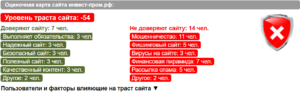 Дальше мы начали проверять данный «нефтяной» проект на сайте доверие и увидели, что уровень траста сайта в глубоких минуса: -54. Довольно много человек не доверяют проекту, пользователи написали что сайт мошеннический, считают данный проект фишинговым, некоторые написали, что это финансовая пирамида. Добавили, что с сайта им на почту приходит спам. Получается, что доверия к ресурсу «нефтяной» компании Инвест-Пром в интернете немного, видимо никто не горит желанием вкладывать средства в данный проект, имеющий вертикальную интеграцию.