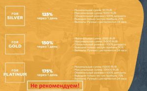 Что касается маркетинга, то сюда нужно вложить минимум 30 рублей. Прибыльность, в зависимости от тарифа – 25, 50 и 75 процентов чистыми в сутки. Админ указывает прибыльность вместе с телом депозита, но проблема в том, что тут действует правила обязательного реинвеста. А это значит, что прежде чем вывести прибыль, необходимо сделать реинвест своего вклада через личный кабинет. То есть, вы сможете выводить только проценты, а не тело депозита.