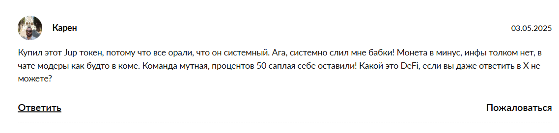 Самая показательная часть анализа — это настроения холдеров. Если изучить Jup отзывы на профильных форумах вроде Reddit, картина складывается скептическая. Большинство инвесторов не верит в обещания руководства о росте курса до 5-8 долларов. В русскоязычном сегменте честные Jup отзывы полны недоверия: пользователи отмечают отсутствие гарантий и финансового регулятора. Многие держатели открыто заявляют, что при малейшем росте цены будут массово избавляться от этого актива.