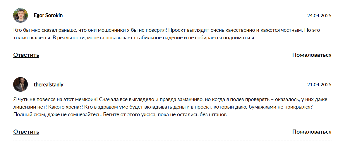 Главная проблема проекта — абсолютная анонимность команды разработчиков, выступающих под псевдонимами вроде Weremeow. Никаких юридических данных или официальной регистрации у платформы нет. Кроме того, вопросы вызывает токеномика монеты: при общей эмиссии в 10 миллиардов единиц, по разным оценкам, от 40% до 50% всех активов может находиться под прямым контролем создателей. Такая концентрация власти позволяет легко манипулировать курсом и устраивать масштабные дампы.
