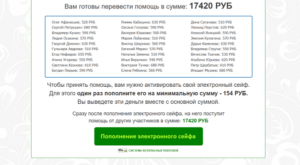 Далее мы попадаем на новую страницу, где нам сообщают, что на наше имя открыт электронный сейф ID: 201089657463387 и на этот сейф с сайта «Народная Казна» нам якобы перечислят 17 420 рублей. Я проверил этот сайт на двух браузерах с разных IP-адресов, но номер у сейфа не изменился, да и сумма осталась прежней. А это говорит о том, что сайт работает по заданной программе и все пользователи получают одну и ту же информацию. Ниже мы видим список тех, кто якобы планирует перевести нам деньги. А еще ниже аферисты сообщают нам, что для активации электронного сейфа нужно перечислить на него сумму в 154 рубля.