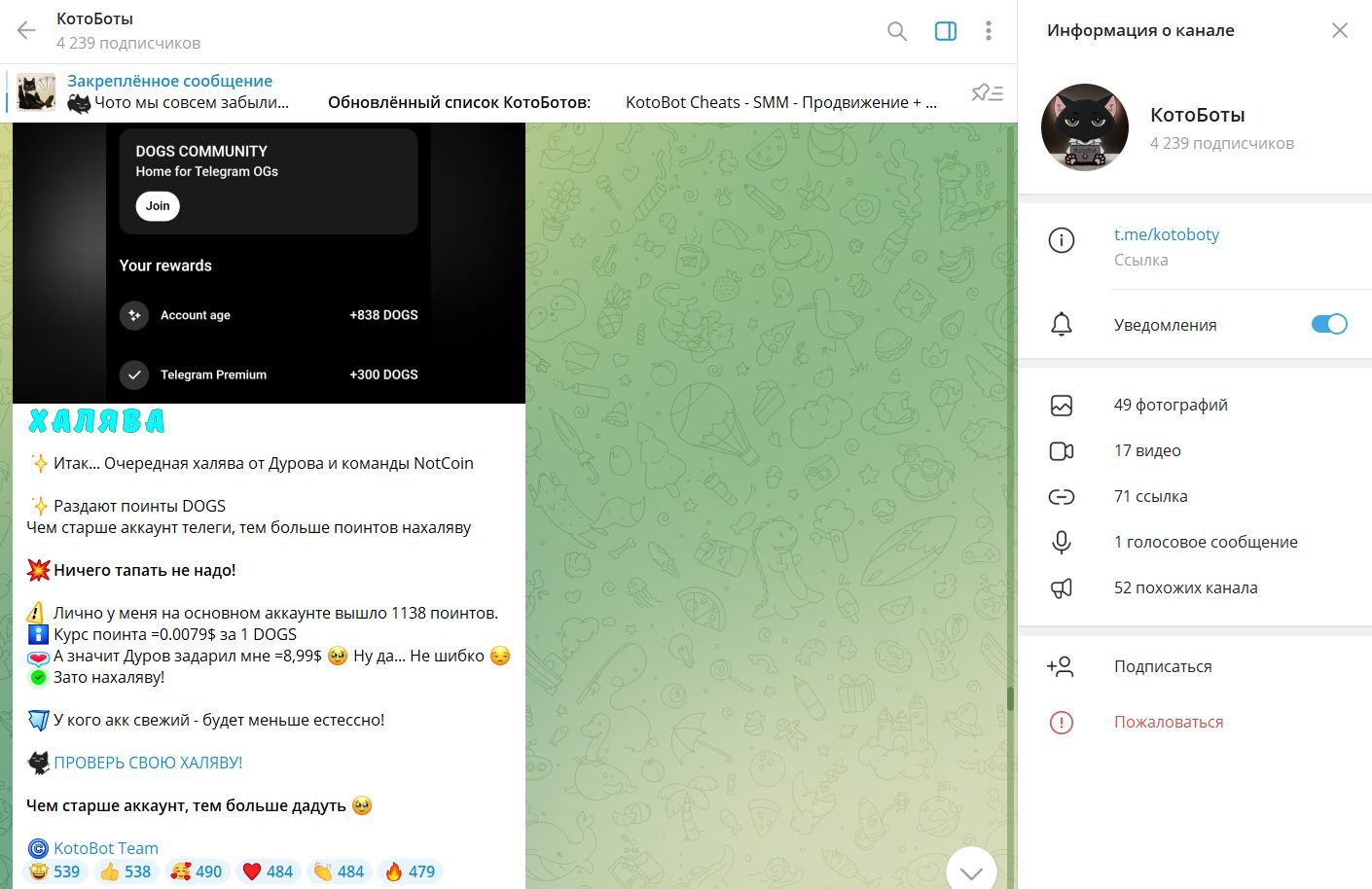 Канал t.me/kotoboty существует уже приличное время, но статистика его активности вызывает лишь ироничную улыбку. При заявленной аудитории в несколько тысяч подписчиков публикации еле собирают по две сотни просмотров. Это верный признак того, что большая часть аудитории — это просто мертвые души или накрученные боты, создающие иллюзию популярности. Настоящие живые люди здесь появляются редко, и чаще всего это новички, случайно заглянувшие на огонек. Администратор начинает свою обработку очень мягко. Сначала вам показывают смешного кота, который не хочет идти на работу, а буквально в следующем посте предлагают уникальную возможность стать криптомиллионером. Контраст настолько разительный, что критическое мышление у неподготовленного читателя просто отключается. Вы расслабились, улыбнулись, а вам тут же подсовывают ссылку на очередной гениальный проект с обещаниями баснословной доходности. Именно так и работает современный маркетинг на доверии, где вместо агрессивных продаж используются кошачьи лапки и пушистые хвосты.