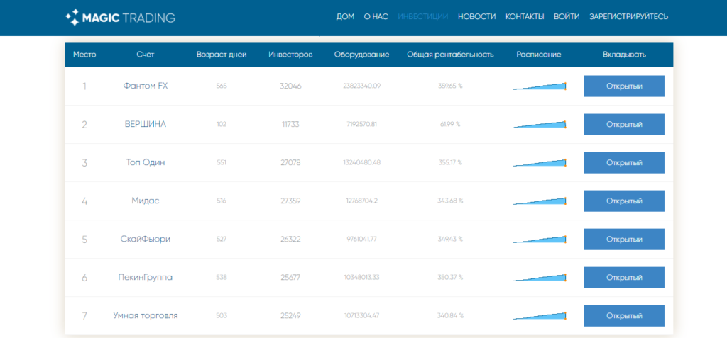 Magic Trading — это инвестиционный сервис, который позволяет вам зарабатывать на торговле акциями, инвестируя в счета опытных трейдеров. Простые и удобные инструменты для получения ежедневного дохода с мгновенным выводом средств на проверенные платежные системы. Magic Trading подчеркивает использование спекулятивных стратегий, которые являются одновременно диверсифицированными и прибыльными по отношению к инвестиционному капиталу. Команда технически готова гибко реагировать на любые изменения рынка и экономические катаклизмы.