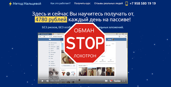 Аферисты с сайта «Метод Мальцевой» скомпоновали в восемь видеороликов доступную в интернете информацию и продают ее доверчивым людям за 980 рублей. Сама методика − покупка товаров по системе СРА, то есть вы будете посредником между продавцами и производителями какой-то продукции. Кто-то выпускает товар, вы рекламируете его на чьем-то сайте или форуме, а при покупке товаров вы будет получать процент. Но здесь ведь развод в том, что такой метод никак нельзя назвать пассивным, так как вам нужно будет искать в интернете продавцов и покупателей и заключать с ними сделки.