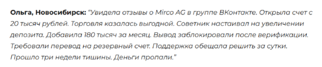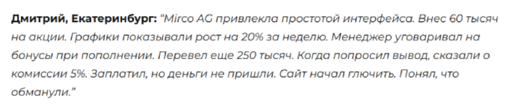 Но спектакль начинается в момент попытки забрать прибыль. Как только поступает заявка, система ломается. Менеджеры требуют оплатить вереницу налогов, выдуманных комиссий и страховок. Главный показатель работы конторы — это честные Micro AG отзывы, полные отчаяния. Люди теряют тысячи долларов, так как после оплаты сборов аккаунт просто блокируется. Изучая настоящие Micro AG отзывы, поражаешься масштабам трагедии и абсолютному цинизму авторов площадки.