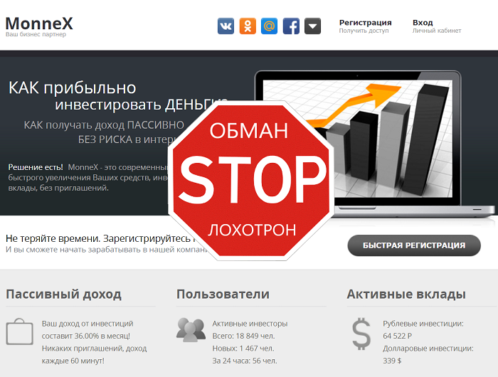Схема проста: обещают 1,2% в день за вклад от 1 доллара или же рубля. Верхней планки не устанавливают, но чем больше вложите, тем быстрее ваши данные удалят, а деньги – присвоят. В сети нет ни одного отзыва от живых людей, которым бы удалось вывести деньги из Monnex, ведь при запросе на вывод мошенники требуют у вас полный список документов, с помощью которых они с подельниками наберут онлайн-кредитов на ваше имя, а уже через пару месяцев придёт письмо о долге, а потом – повестка в суд, так что придётся неплохо потратится на адвоката. Никогда и ничего им не передавайте, а лучше сразу проходите мимо, если видите предложение выше 10-15% дивидендов в год.