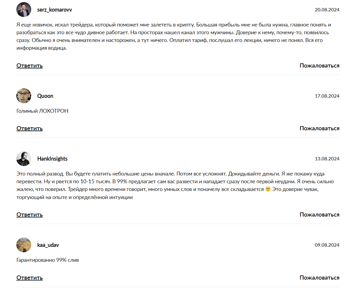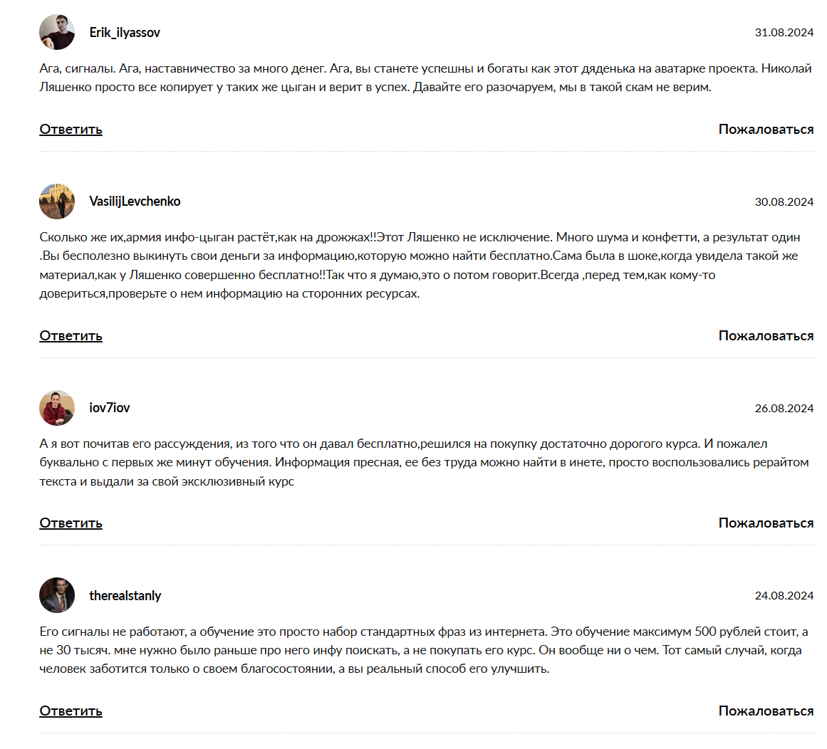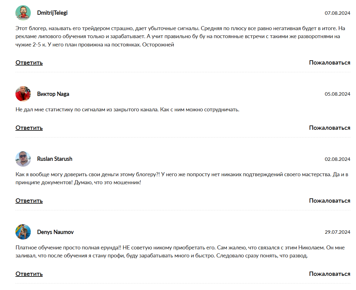 Если вы попытаетесь найти счастливых выпускников, которые последовали советам этого гуру и улетели зимовать на Мальдивы, вас ждет суровое разочарование. Настоящие, не прилизанные Николай Ляшенко отзывы — это хроника потерянного времени, разбитых надежд и слитых подчистую депозитов. Люди, купившие эти так называемые образовательные программы, в один голос твердят об абсолютной и беспросветной бесполезности предоставленного материала.