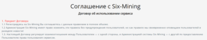 Убедиться в том, что платформу Six-Mining создавали весьма продуманные ребята, можно не только на основании того, что вся информация о владельцах засекречена. Если обратить внимание на «Соглашение», которое при регистрации автоматически подписывает каждый пользователь, то становится ясно, что авторы этого сервиса постарались дистанцироваться от любой ответственности. Ссылку на «Соглашение» вы можете найти в футере этого псевдо-майнингового сервиса и там есть немало интересных пунктов.
