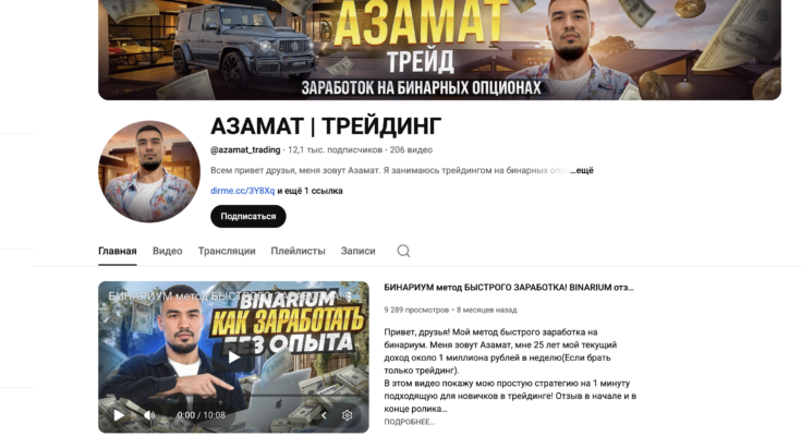 YouTube-канал «Азамат Трейдинг» позиционируется как образовательный и аналитический ресурс, посвящённый торговле на финансовых рынках. Автор делится собственным взглядом на трейдинг, публикует разборы сделок, рассуждает о стратегиях и дисциплине, а также затрагивает темы психологии и заработка на рынке. На первый взгляд контент выглядит как личный блог практикующего трейдера, однако при более внимательном анализе возникает ряд вопросов.