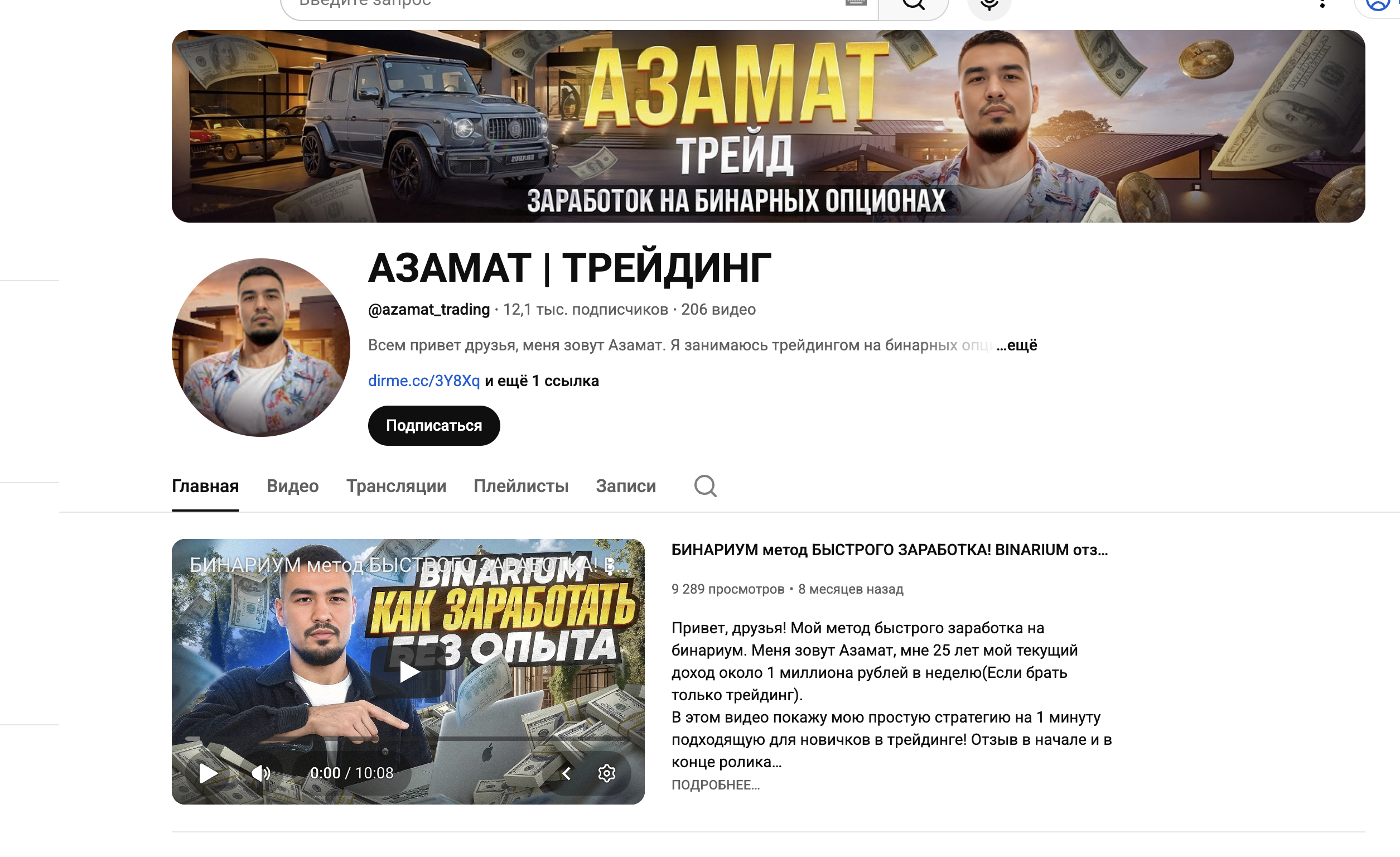 YouTube-канал «Азамат Трейдинг» позиционируется как образовательный и аналитический ресурс, посвящённый торговле на финансовых рынках. Автор делится собственным взглядом на трейдинг, публикует разборы сделок, рассуждает о стратегиях и дисциплине, а также затрагивает темы психологии и заработка на рынке. На первый взгляд контент выглядит как личный блог практикующего трейдера, однако при более внимательном анализе возникает ряд вопросов.