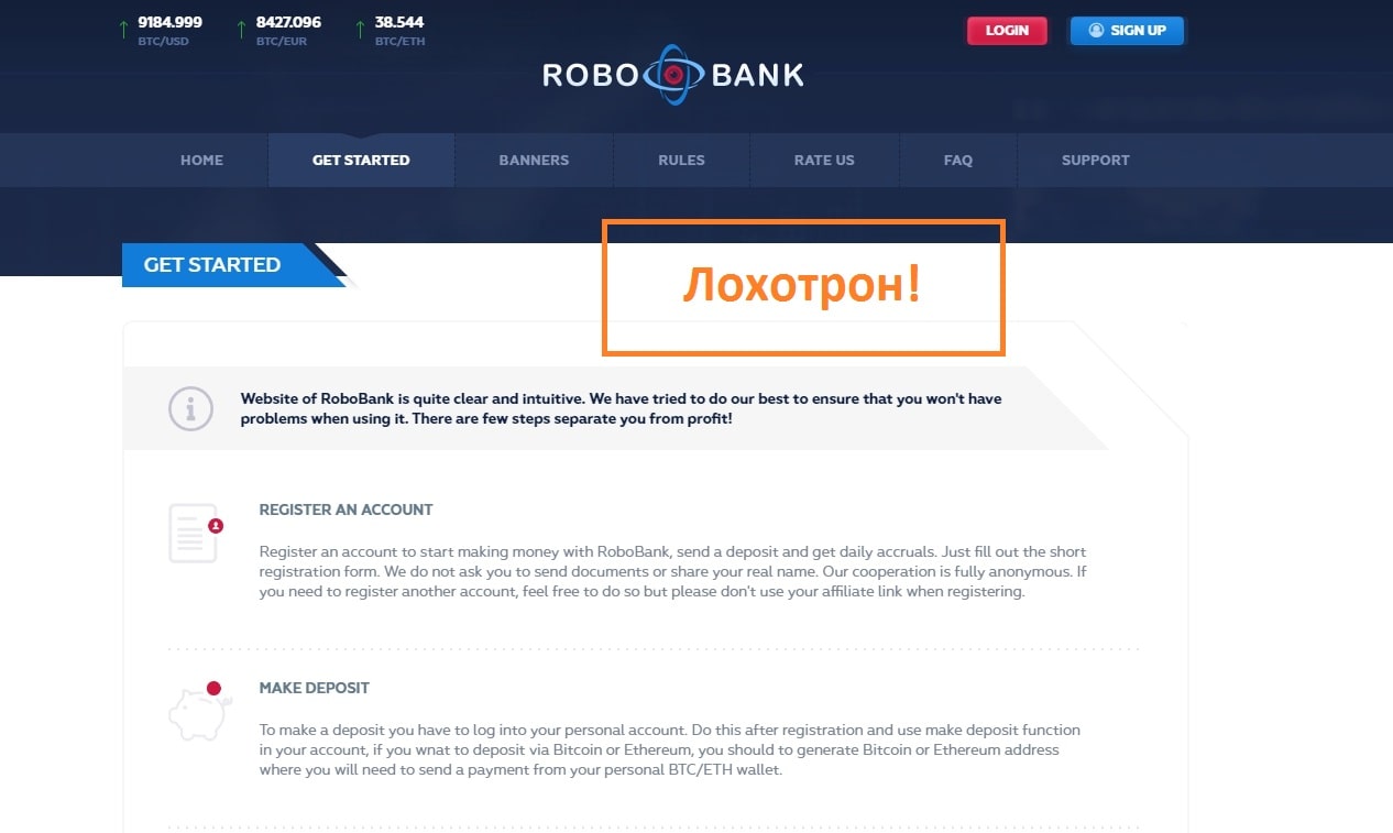 Вот только никакого заработка на robobank.org не будет. Как мы уже сказали выше, это никакая не инвестиционная компания, ни с какой криптовалютой она не работает. Это классический псевдоинвестиционный проект, а все рассказы о заработке на разнице курсов криптовалют – просто легенда, которая здесь используется.