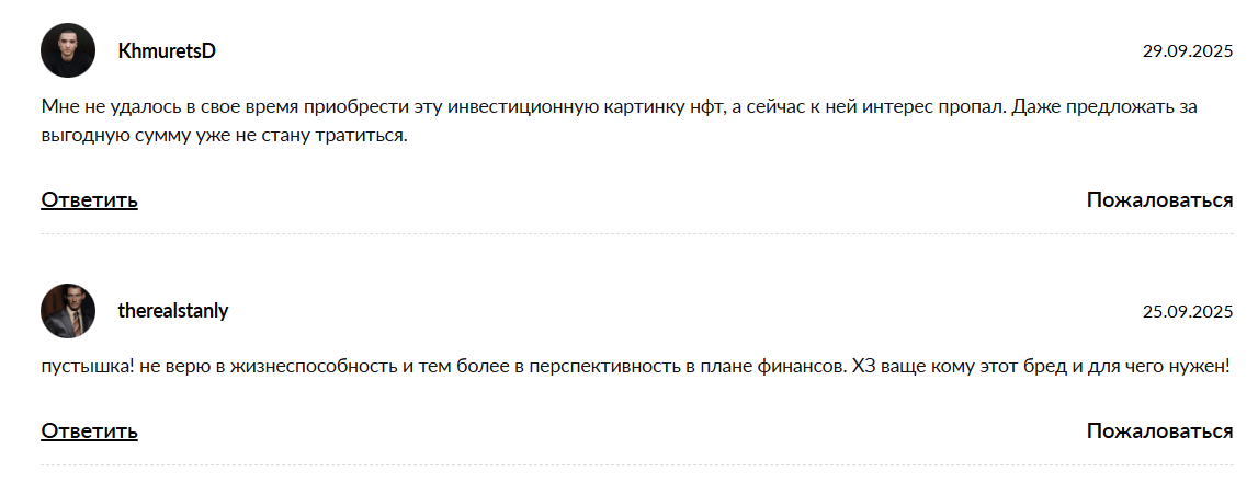 Поскольку торговля ведется децентрализованно между самими пользователями, классический вопрос «как вернуть деньги» здесь лишен всякого смысла. В блокчейне не существует чарджбэков или службы поддержки, которой можно пожаловаться на неудачную сделку. Если вы купите картинку втридорога у спекулянта, а завтра ее цена рухнет, это будут исключительно ваши финансовые убытки. Подводя итог: проект интересен исключительно как сувенир на память, но рассматривать его как инструмент для заработка мы категорически не советуем.