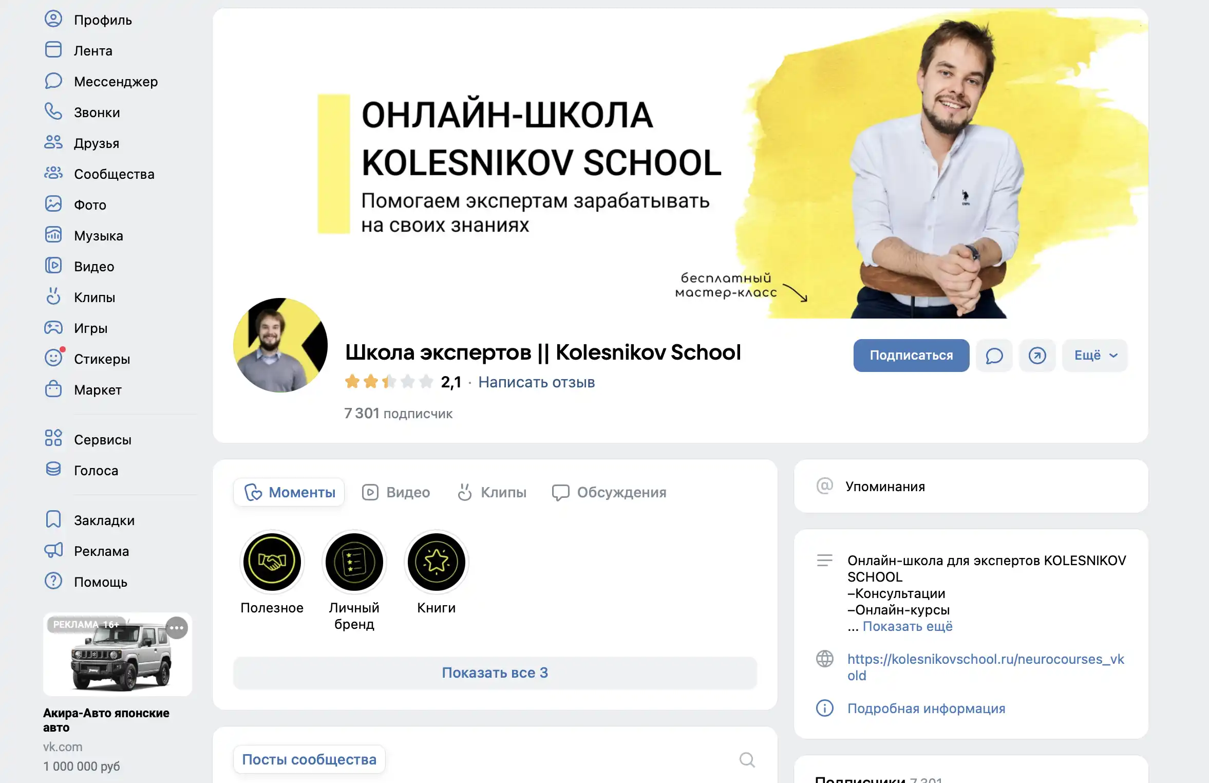 Павел Колесников представлен как опытный репетитор-предприниматель, прошедший путь от индивидуальных занятий до создания собственной школы. Материалы включают вебинары, видеоуроки и поддержку. Группа в VK используется для общения, но активность низкая: последние посты датированы годами ранее, что указывает на возможный сдвиг фокуса на другие платформы. Бесплатные ресурсы, такие как нейро-курсы, служат для привлечения, а платные обещают пошаговый запуск бизнеса.