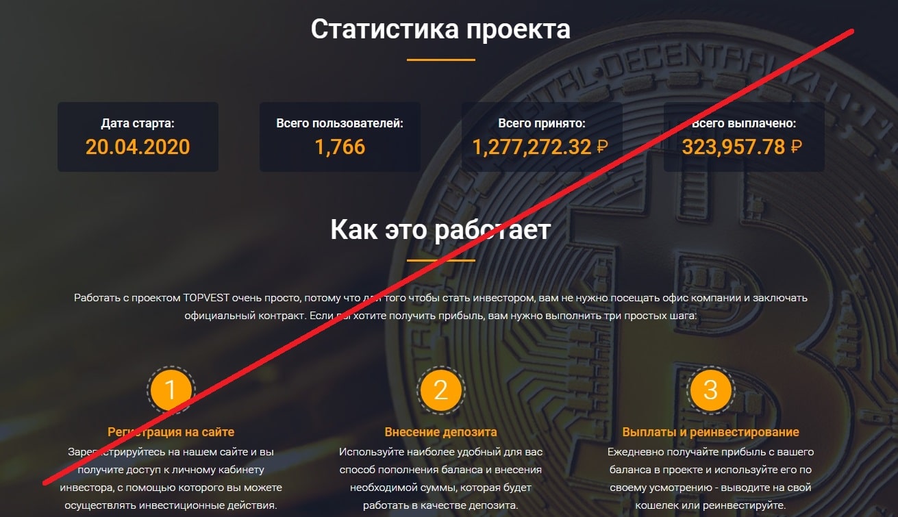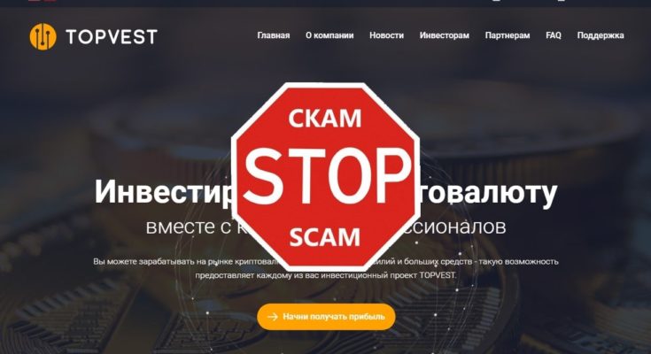 TOPVEST – типа компания, которая занимается криптовалютным трейдингом. Нам предлагают сюда вложиться и, соответственно, получать стабильную и, что особенно важно, высокую прибыль. Причем доход реально очень высокий, можно сказать, что неадекватный. Конечно же, это сразу выдает в данном проекте откровенный лохотрон. Классический баблосборщик от опытного админа. Только за последние несколько дней он вывалил в сеть сразу несколько однотипных «инвестиционных компаний», за счет чего и собирается зарабатывать деньги.