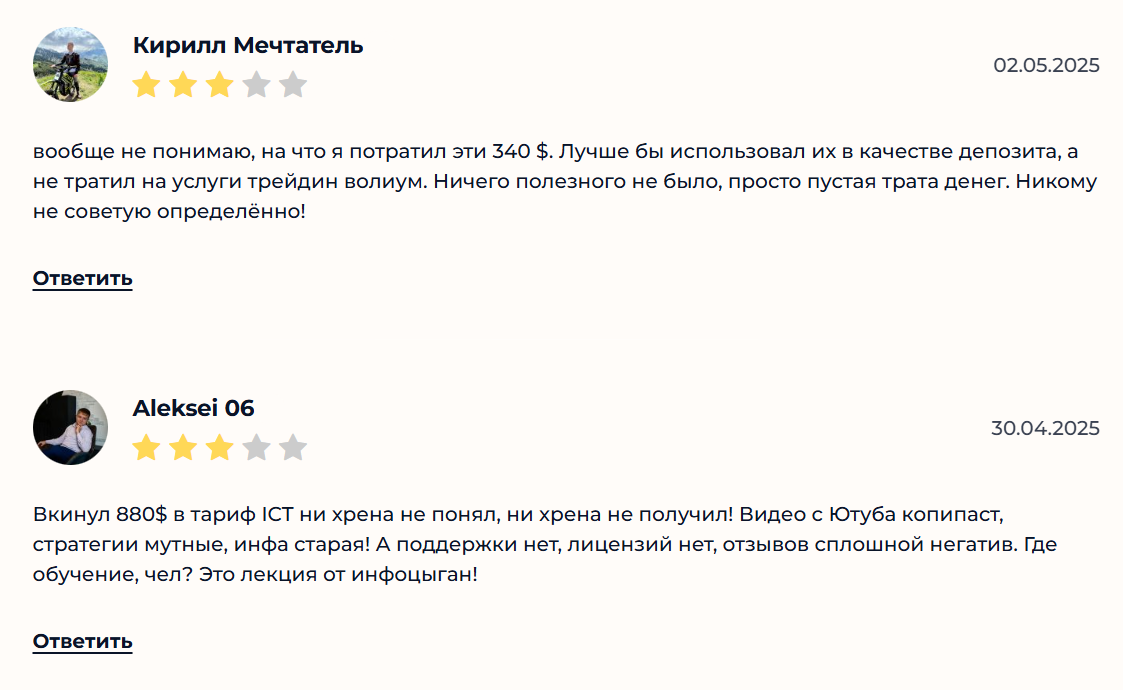 Отдельного внимания заслуживает качество самого преподавания. Клиенты, поверившие в красивую сказку и отстегнувшие кругленькую сумму за приватные чаты, остаются в полном недоумении. В сети полно историй от людей, которые заплатили сотни долларов, но так и не увидели ничего полезного. Подача материала максимально водянистая, изобилует сложной, но абсолютно бессмысленной терминологией, цель которой — запутать ученика и создать иллюзию невероятной экспертности преподавателя. Когда же разочарованные подписчики начинают задавать неудобные вопросы в комментариях или указывать на откровенные промахи в прогнозах, их сообщения технично игнорируются или подчищаются. Вся эта структура держится исключительно на агрессивном маркетинге и непрерывном притоке новых наивных искателей легкой наживы.