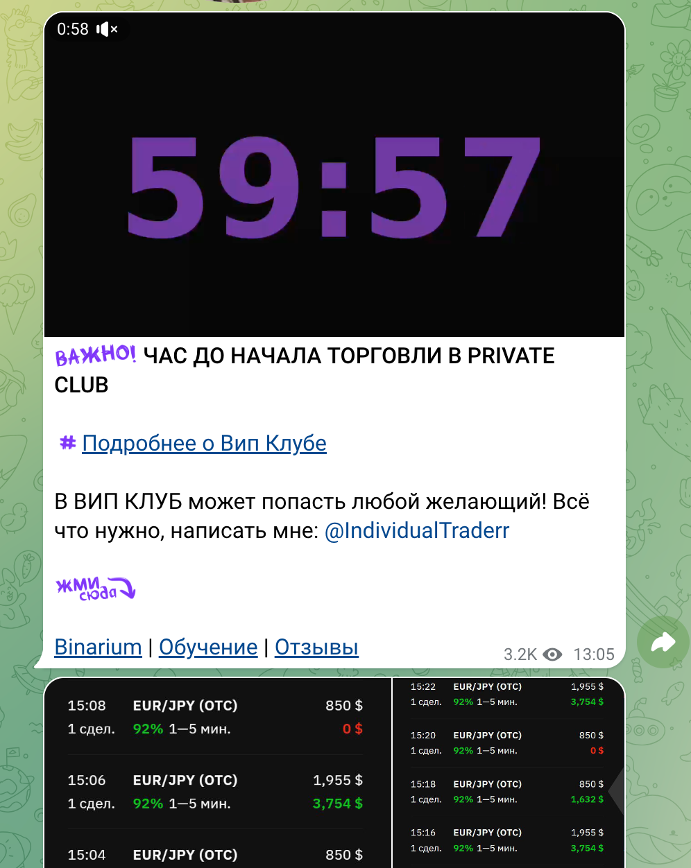 Основу контента составляют скриншоты выплат, истории успеха участников и краткие отчеты по сделкам. Частота публикаций высокая — от 3 до 6 постов в день. В текстах регулярно прослеживается психологическое давление, связанное с ограничением времени и количеством мест. Акцент делается на быстрый заработок, что усиливает эмоциональное восприятие информации.
