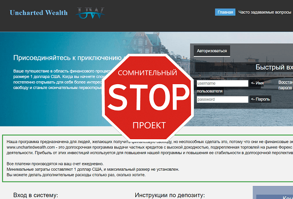 Uncharted Wealth – инвестиционный проект, представляющий собой один из самых долгоиграющих хайпов на профильном рынке. Он был запущен еще в феврале прошлого года, то есть, работает почти два года. По легенде, эта компания, которой, естественно, в реальности не существует, занимается торговлей на бирже Форекс, а также инвестициями в различные фонды и активы. Несмотря на то, что многие сайты-мониторинги хайпов в один голос утверждают, что проект платит, причем абсолютно стабильно и без всяких танцев с бубнами, в сети все же можно встретить отрицательные отзывы о его деятельности. Кроме того, отмечается минусовой уровень траста сайта. Все это говорит о том, что связываться с Uncharted Wealth все же не рекомендуется.