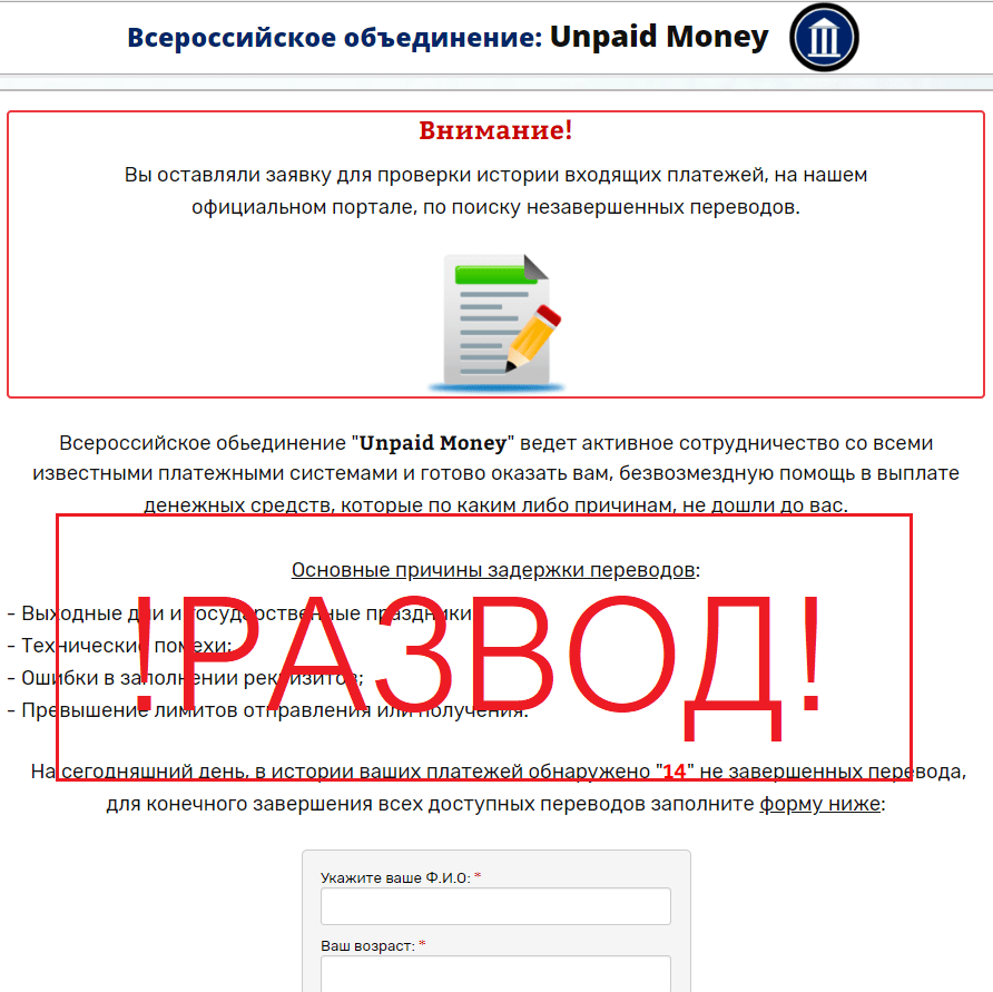 Unpaid Money-это еще один мошеннический проект, который аферисты совсем недавно запустили. Пока он не начал развиваться, мы должны рассказать и показать, что это за люди, моя задача уберечь вас от подобных разводов. Всероссийское объединение, которое с ног до головы вымышлено и не имеет ни капли правды, и якобы вы оставили заявку для проверки платежей на сайте по незавершенным операциям. То есть сайт, который может вам вернуть деньги, которые вы по каким то причинам не получили их, ведь платформа сотрудничает со многими платежными системами. Естественно это только на словах, ведь все это не настоящее.