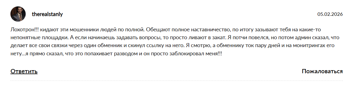 Схема продумана. Обучение предлагают якобы бесплатно, прося процент от прибыли. Новичкам даже дают сделать первый тестовый круг в плюс, чтобы усыпить бдительность. Катастрофа начинается при работе с реальными депозитами.
