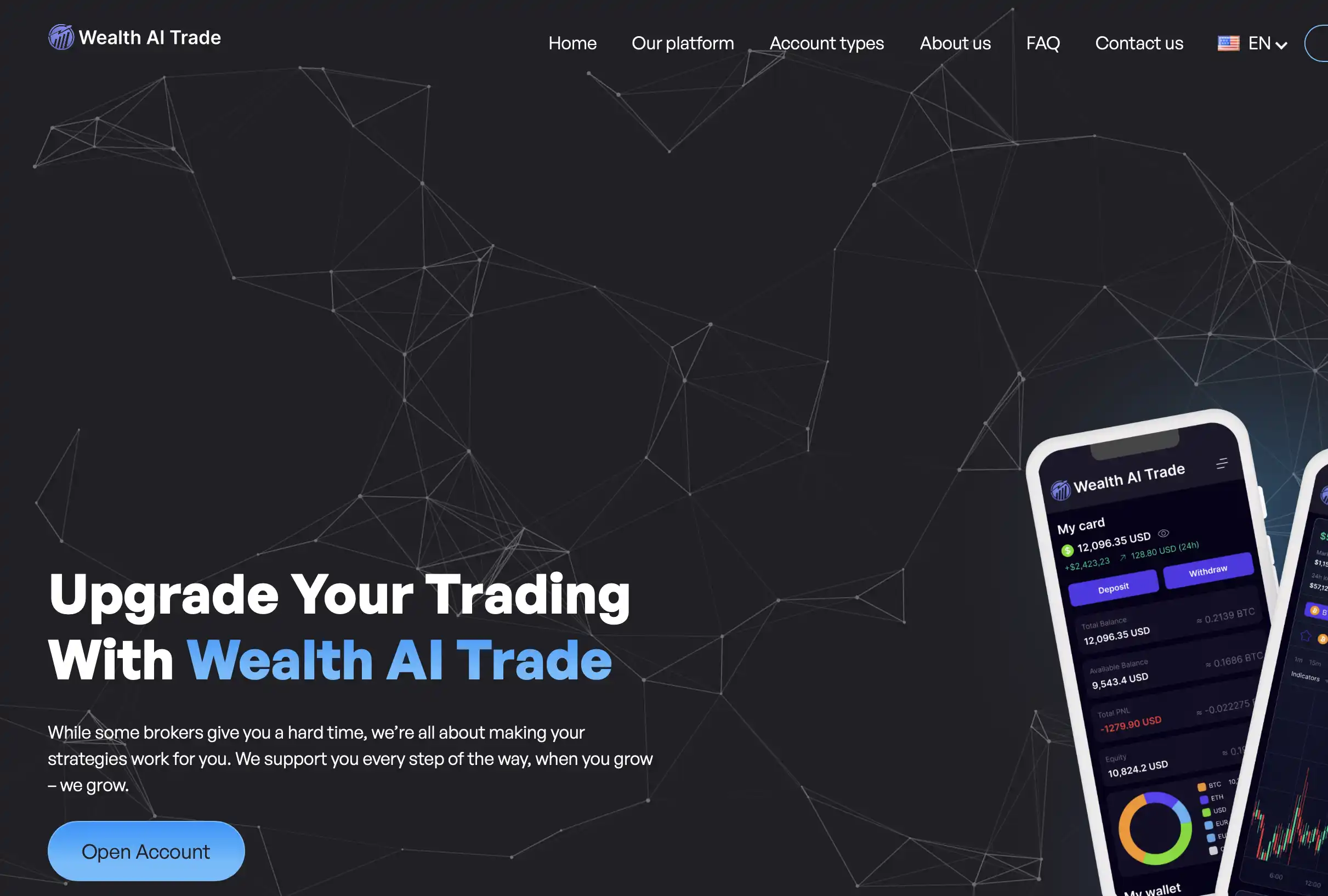 Wealth AI Trade (website: wealthaitrade.com) позиционирует себя как современная платформа для торговли на финансовых рынках: форекс, акции, криптовалюты, товары. В маркетинговых материалах упоминаются “низкие комиссии”, “отсутствие скрытых платежей”, “трейдинг с ИИ-алгоритмами”, “вывод средств быстро” и “обучение для клиентов”.