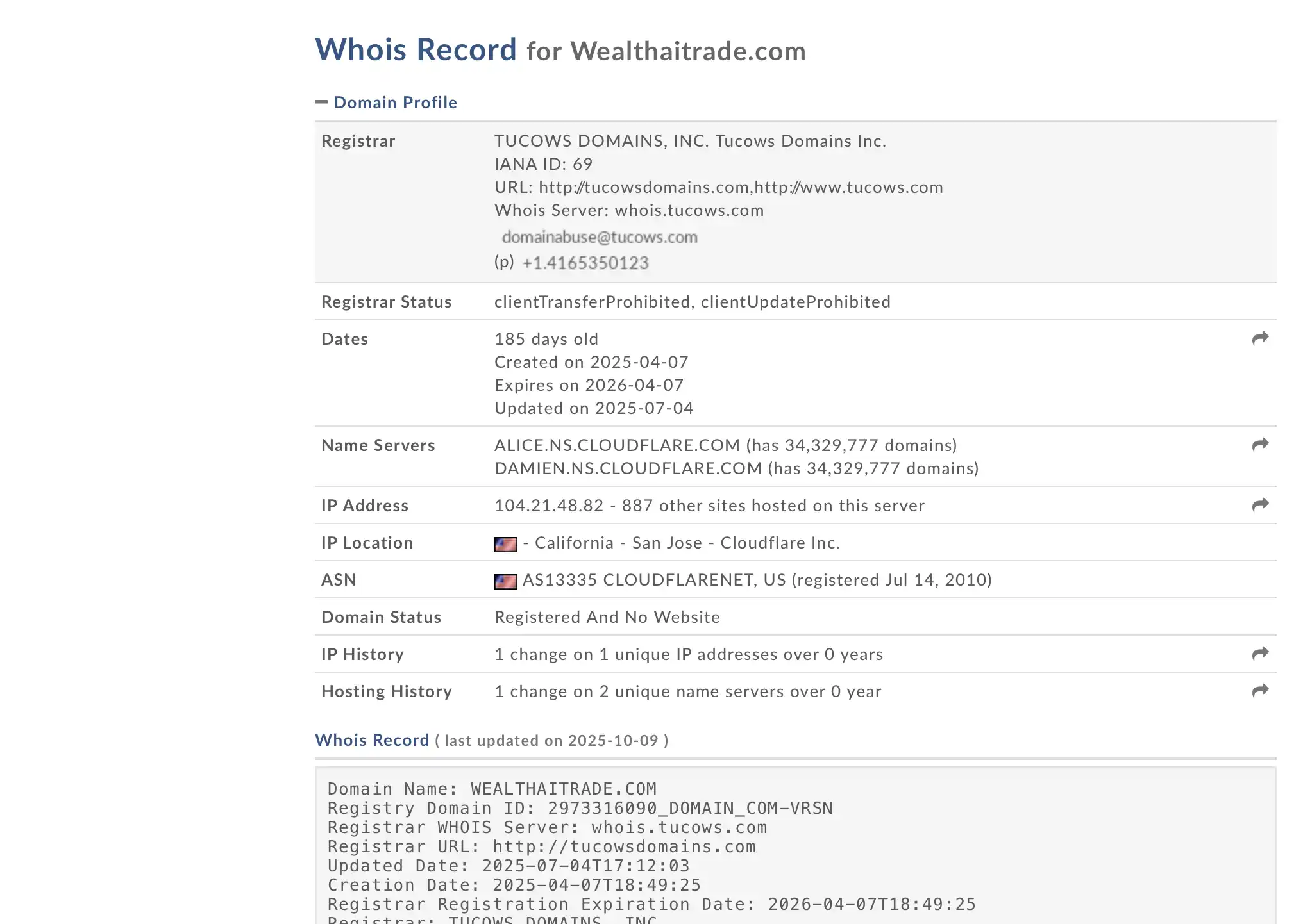 • Платформа Scamadviser оценивает сайт wealthaitrade.com как высокий риск, с низким уровнем доверия, частично из-за скрытых контактных данных, молодого домена и подозрительных признаков.